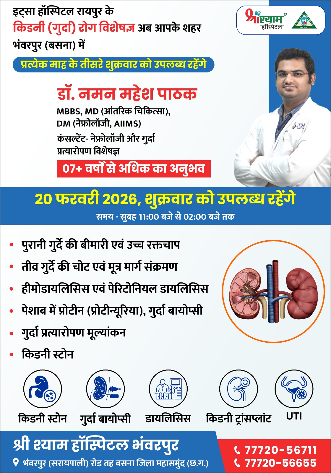 इट्सा हॉस्पिटल रायपुर के किडनी (गुर्दा) रोग विशेषज्ञ भंवरपुर (बसना) में 20 फरवरी को श्री श्याम हॉस्पिटल में उपलब्ध रहेंगे
