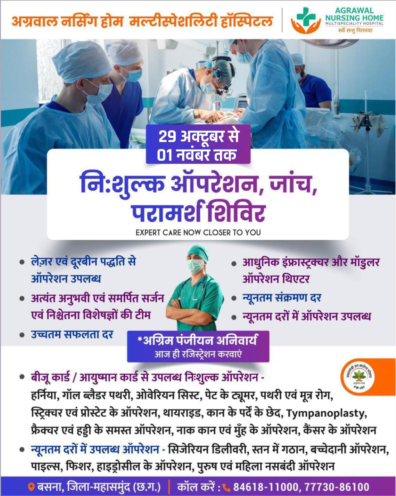 सरायपाली.अग्रवाल नर्सिंग होम में 29 अक्टूबर से 01 नवंबर तकनिःशुल्क ऑपरेशन, जांच, परामर्श शिविर रखा गया है जिसमें विभिन्न प्रकार के लेज़र एवं दूरबीन पद्धति से ऑपरेशन उपलब्ध