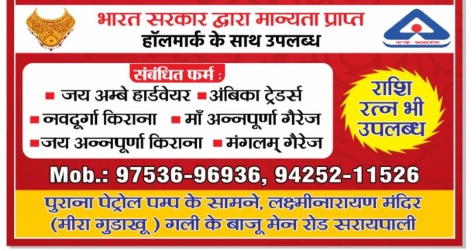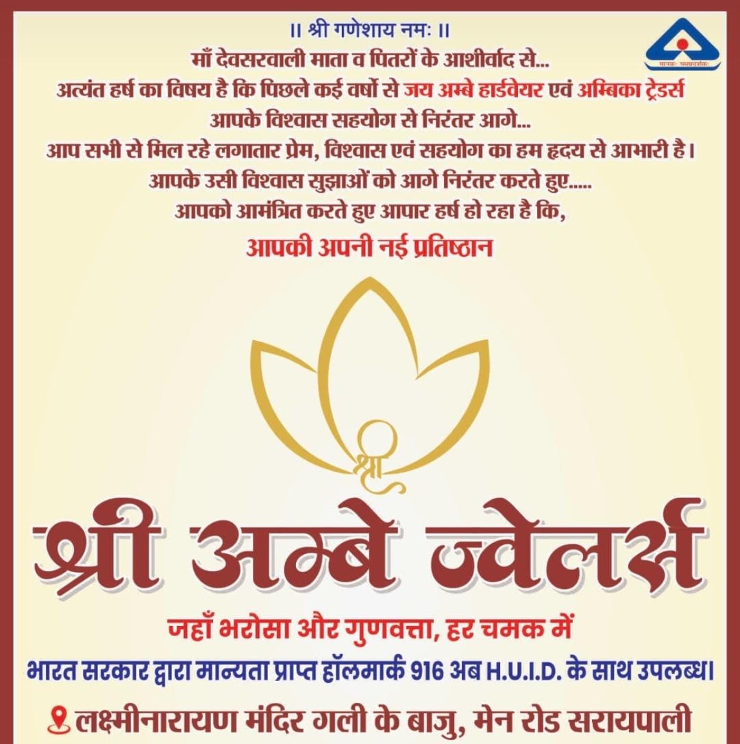 सरायपाली। शहर में भरोसे और गुणवत्ता की एक नई पहचान के रूप में श्री अंबे ज्वेलर्स ने अपनी सेवाओं की शुरुआत कर दी है। उल्लेखनीय है कि पिछले 43 वर्षों से जय अंबे हार्डवेयर एवं जय अंबे फर्टिलाइज़र द्वारा सतत रूप से दी जा रही विश्वसनीय सेवा के बाद अब संस्थान ने ज्वेलरी क्षेत्र में कदम बढ़ाया है।