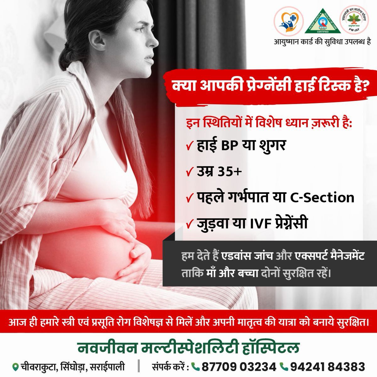 हम देते हैं एडवांस जांच और एक्सपर्ट मैनेजमेंट ताकि माँ और बच्चा दोनों सुरक्षित रहें। और बच्चे और मां स्वस्थ रहे। यदि कोई भी इन समस्याओं से जूझ रहे हों तो आज ही हमारे स्त्री एवं प्रसूति रोग विशेषज्ञ से मिलें और अपनी मातृत्व की यात्रा को बनाये सुरक्षित। तथा आयुष्मान कार्ड की सुविधा भी उपलब्ध है। अधिक जानकारी के लिए संपर्क करें।नवजीवन मल्टीस्पेशलिटी हॉस्पिटल चीवराकुटा, सिंघोड़ा, सराईपाली,संपर्क करें : 87709032349424184383