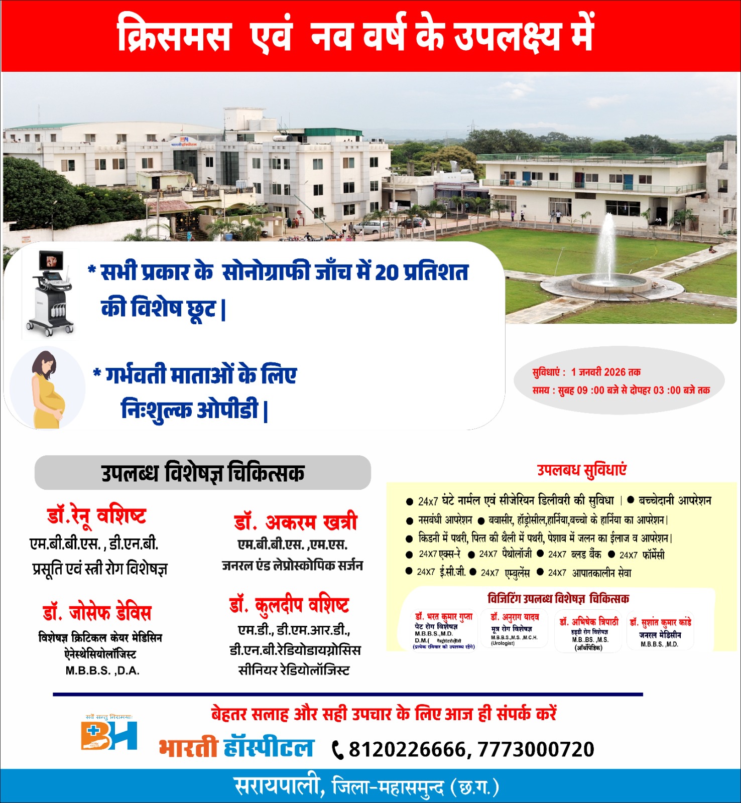 सरायपाली। क्रिसमस एवं न्यू वर्ष के अवसर पर न्यू भारती हॉस्पिटल द्वारा सभी प्रकार के सोनोग्राफी जाँच में 20 प्रतिशत की विशेष छूट दिया गया है तथा गर्भवती माताओं के लिए निःशुल्क ओपीडी की भी सुविधा दी गई है। यहां पर उपलब्ध विशेषज्ञ चिकित्सक:-डॉ.रेनू वशिष्ट (एम.बी.बी.एस., डी.एन.बी. प्रसूति एवं स्त्री रोग विशेषज्ञ),डॉ.जोसेफ डेविस विशेषज्ञ (क्रिटिकल केयर मेडिसिन ऐनेस्थेसियोलॉजिस्ट M.B.B.S., D.A.)