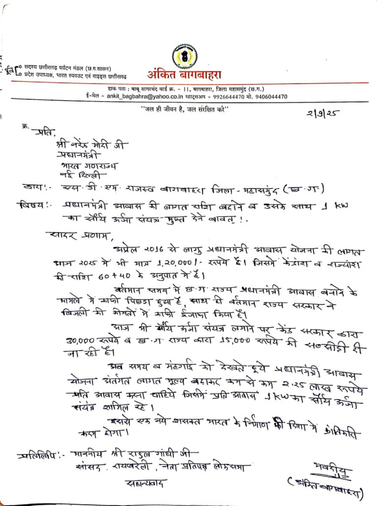 इस समस्या को देखते हुए अंकित बागबाहरा ने देश के प्रधानमंत्री के नाम एसडीएम बागबाहरा को पत्र सौंपा, जिसमें प्रधानमंत्री आवास ग्रामीण की लागत ₹3 लाख 25 हजार किए जाने व साथ में एक किलोवाट सौर ऊर्जा संयंत्र की लागत शामिल करने की मांग की गई है। वर्तमान में केंद्र व राज्य मिलाकर सौर उपकरण स्थापना पर लगभग ₹45 हजार की सब्सिडी देते हैं। सौर ऊर्जा संयंत्र को इस योजना में शामिल कर देना ग्रामीणों के लिए कई तरह की समस्याएं कम करेगा।