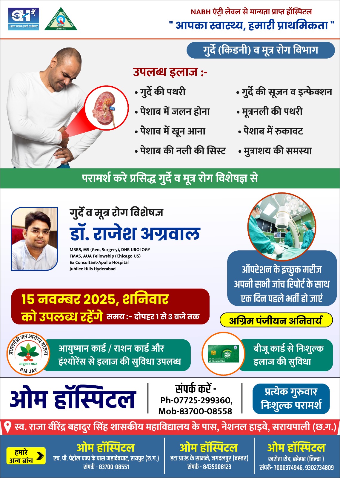 सरायपाली.NABH एंट्री लेवल से मान्यता प्राप्त ओम हॉस्पिटल में 15 नवम्बर 2025 को प्रसिद्ध गुर्दे व मूत्र रोग विशेषज्ञ डॉ. राजेश अग्रवाल MBBS, MS (Gen, Surgery), DNB UROLOGY FMAS, AUA Fellowship (Chicago-US) Ex Consultant-Apollo Hospital Jubilee Hills Hyderabadदोपहर 1 से 3 बजे तक उपस्थित रहेंगे। उनके गुर्दे (किडनी) व मूत्र रोग विभाग के द्वारा उपलब्ध इलाज :-गुर्दे की पथरी,पेशाब में जलन होना,पेशाब में खून आना,पेशाब की नली की सिस्ट,गुर्दे की सूजन व इन्फेक्शन,मूत्रनली की पथरी,पेशाब में रुकावट,मुत्राशय की समस्या, की ईलाज किया जाता है। और ऑपरेशन के इच्छुक मरीज अपनी सभी जांच रिपोर्ट के साथ एक दिन पहले भर्ती हो जाएं।अग्रिम पंजीयन अनिवार्य,आयुष्मान भारत PM-JAY,आयुष्मान कार्ड / राशन कार्ड और इंश्योरेंस से इलाज की सुविधा तथा,बीजू कार्ड से निःशुल्क इलाज की सुविधा भी दी गई है।