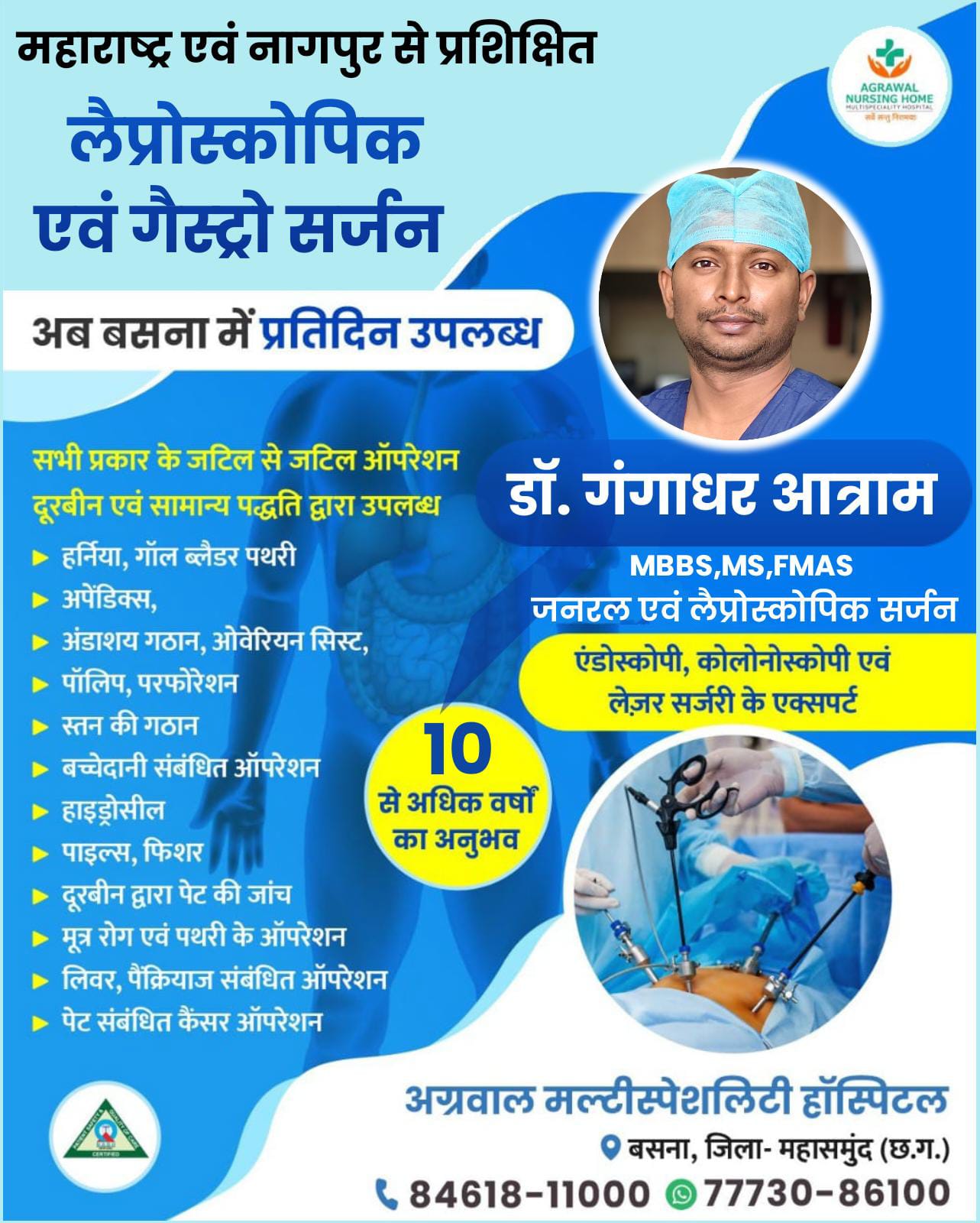 सरायपाली.अग्रवाल नर्सिंग होम बसना में महाराष्ट्र एवं नागपुर से प्रशिक्षित लैप्रोस्कोपिक एवं गैस्ट्रो सर्जन और 10 से अधिक वर्षों का अनुभव रखने वाले डॉ. गंगाधर आत्राम(MBBS, MS,FMAS)जनरल एवं लैप्रोस्कोपिक सर्जन प्रतिदिन उपस्थित रहेंगे। उनके द्वारा सभी प्रकार के जटिल से जटिल ऑपरेशन दूरबीन एवं सामान्य पद्धति द्वारा उपलब्ध है:-