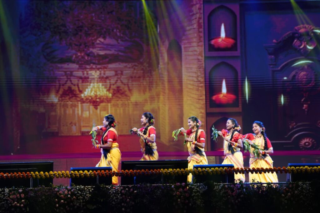 कार्यक्रम का शुभारंभ इंदिरा कला संगीत विश्वविद्यालय, खैरागढ़ के कलाकारों द्वारा प्रस्तुत पारंपरिक पंथी-कर्मा नृत्य से हुआ। ढोल-मांदर की थाप और सामूहिक नृत्य मुद्राओं ने मंच को जीवंत बना दिया। पारंपरिक वेशभूषा और छत्तीसगढ़ी लोकताल की थिरकन ने पूरे वातावरण को राज्य की माटी की महक से भर दिया।