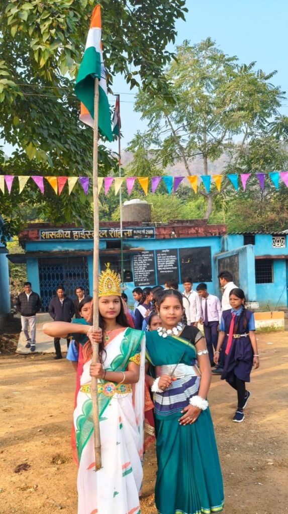 हाई स्कूल के शालानायक कु. खुशबू यादव भारत माता एवं सांस्कृतिक सचिव कु. दिव्या राणा छत्तीसगढ़ महतारी के वेशभूषा धारण कर प्रभात फेरी का नेतृत्व किया। प्रभात फेरी के पश्चात सांस्कृतिक कार्यक्रम का आयोजन रखा गया। जिसमें मुख्य अतिथि के रूप में शाला प्रबंधन एवं विकास समिति अध्यक्ष नेपाल साहू थे तथा कार्यक्रम की अध्यक्षता प्रभारी प्राचार्य एके जायसवाल ने की। विशिष्ट अतिथि के रूप में सरपंच धनुर्जय मरकाम, उपसरपंच त्रिनाथ सेठ, सांसद प्रतिनिधि चुड़ामणी साहू, पर्व सरपंच सुरेन्द्र सेठ, पूर्व उपसरपंच नरहरी साहू, पंचगण बेदराम चौहान, सोनसाय, भूमिसुता बंजारा, मांगमोती, पालक सदस्य उर्मिला सेठ, शिक्षक एल के पटेल, एके पटेल, एसके पटेल, लिपिक हराधन चौधरी, लीला पटेल एवं कैलाश कमार आदि उपस्थित थे। इस अवसर पर छात्रों ने मनमोहक लोकनृत्य की प्रस्तुति दी। कार्यक्रम का संचालन व्यख्याता के के साहू ने की तथा आभार व्यक्त एके जायसवाल ने की।