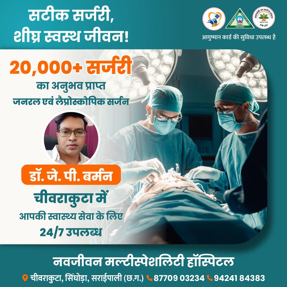 सरायपाली। नवजीवन मल्टीस्पेशलिटी हॉस्पिटल चिवराकुटा में लेजर एवं दूरबीन द्वारा ऑपरेशन कि सुविधा उपलब्ध है।और 10,000+ सर्जरी का अनुभव रखने वाले प्रसिद्ध जनरल एवं लैप्रोस्कोपिक सर्जन डॉ.जे.पी. बर्मन नवजीवन मल्टीस्पेशलिटी हॉस्पिटल में उपस्थित रहते हैं।