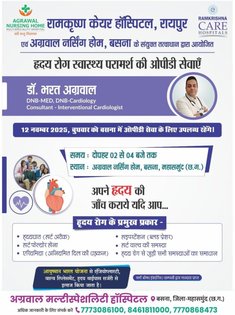 सरायपाली. यूरोसर्जन डॉ. योगेश बारापात्रे 14 नवम्बर को अग्रवाल नर्सिंग होम बसना में रहेंगे उपलब्ध उनके द्वारा मूत्र एवं पथरी जांच परामर्श एवं ऑपरेशन किया जाता है।