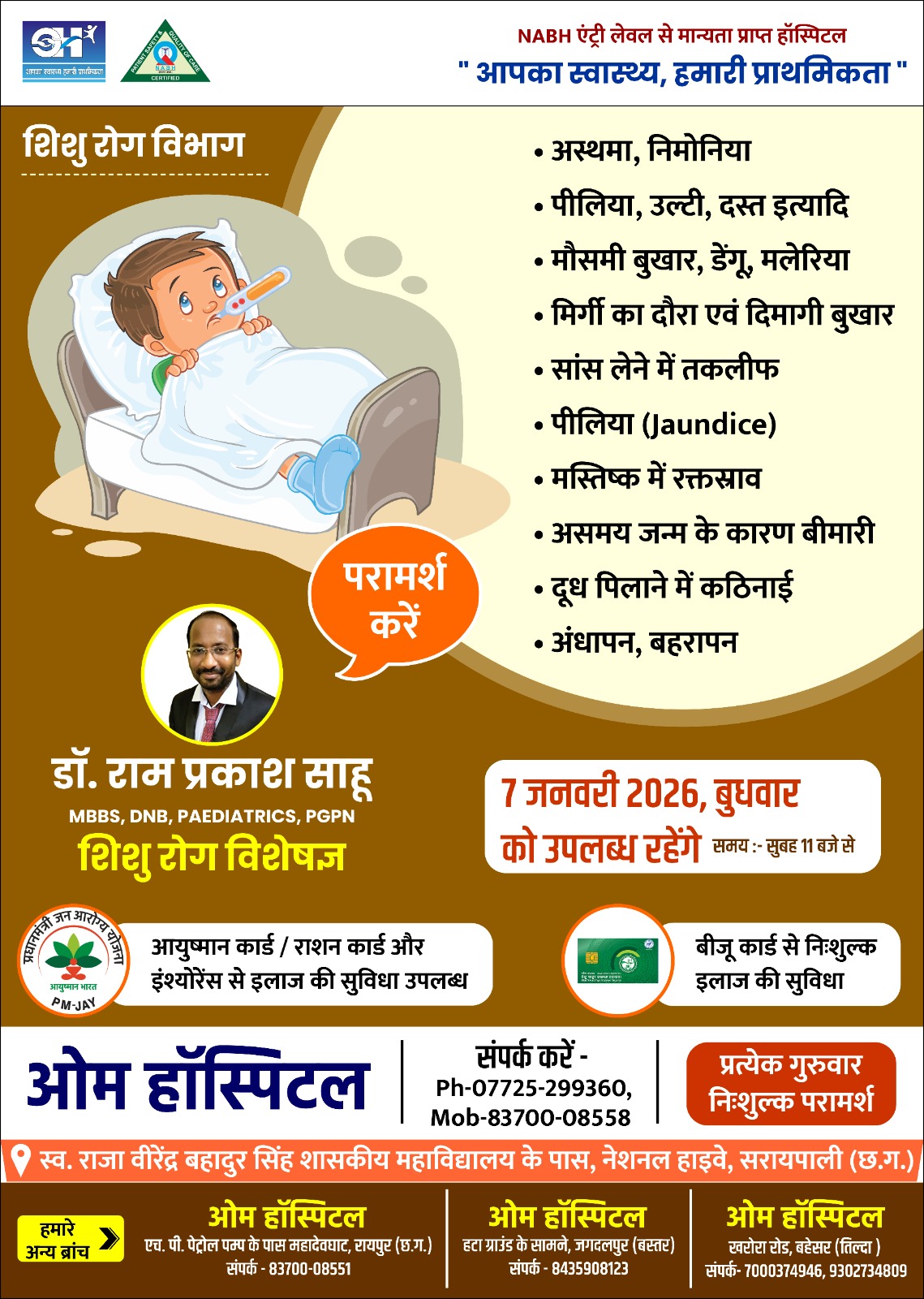 सरायपाली.NABH एंट्री लेवल से मान्यता प्राप्त ओम हॉस्पिटल सरायपाली में शिशु रोग विभाग के विशेषज्ञ डॉ.राम प्रकाश साहू (MBBS, DNB, PAEDIATRICS, PGPN) 07 जनवरी बुधवार को समय :- सुबह 11 बजे से उपस्थित रहेंगे।
