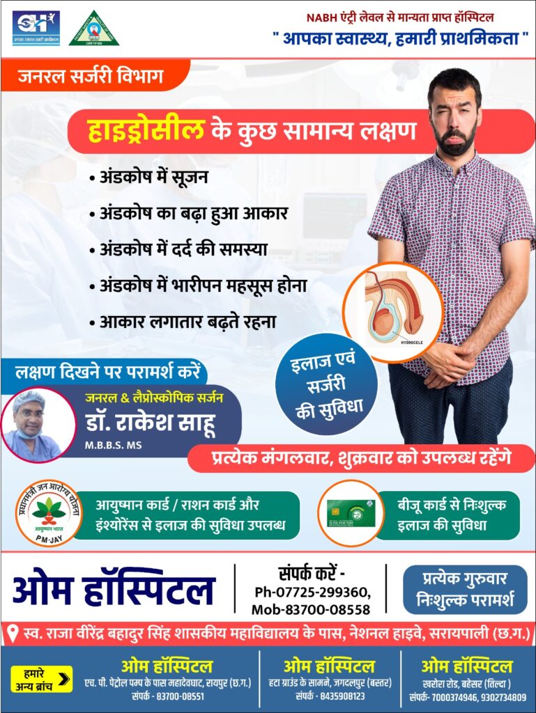 हमारे अन्य ब्रांच-ओम हॉस्पिटल एच. पी. पेट्रोल पम्प के पास महादेवघाट, रायपुर (छ.ग.) संपर्क – 83700-08551ओम हॉस्पिटल हटा ग्राउंड के सामने, जगदलपुर (बस्तर) संपर्क -8435908123 ओम हॉस्पिटल खरोरा रोड, बहेसर (तिल्दा) संपर्क- 7000374946, 9302734809