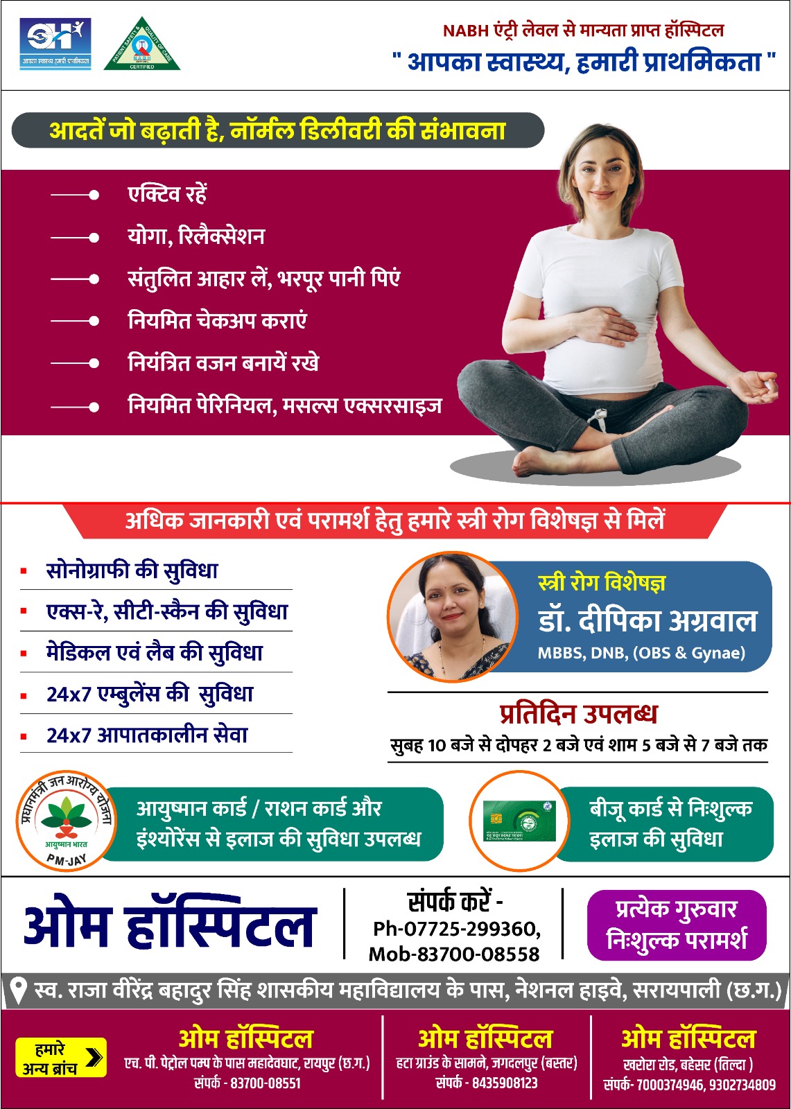 हमारे अन्य ब्रांच-ओम हॉस्पिटल एच. पी. पेट्रोल पम्प के पास महादेवघाट, रायपुर (छ.ग.) संपर्क – 83700-08551ओम हॉस्पिटल हटा ग्राउंड के सामने, जगदलपुर (बस्तर) संपर्क -8435908123 ओम हॉस्पिटल खरोरा रोड, बहेसर (तिल्दा) संपर्क- 7000374946, 9302734809