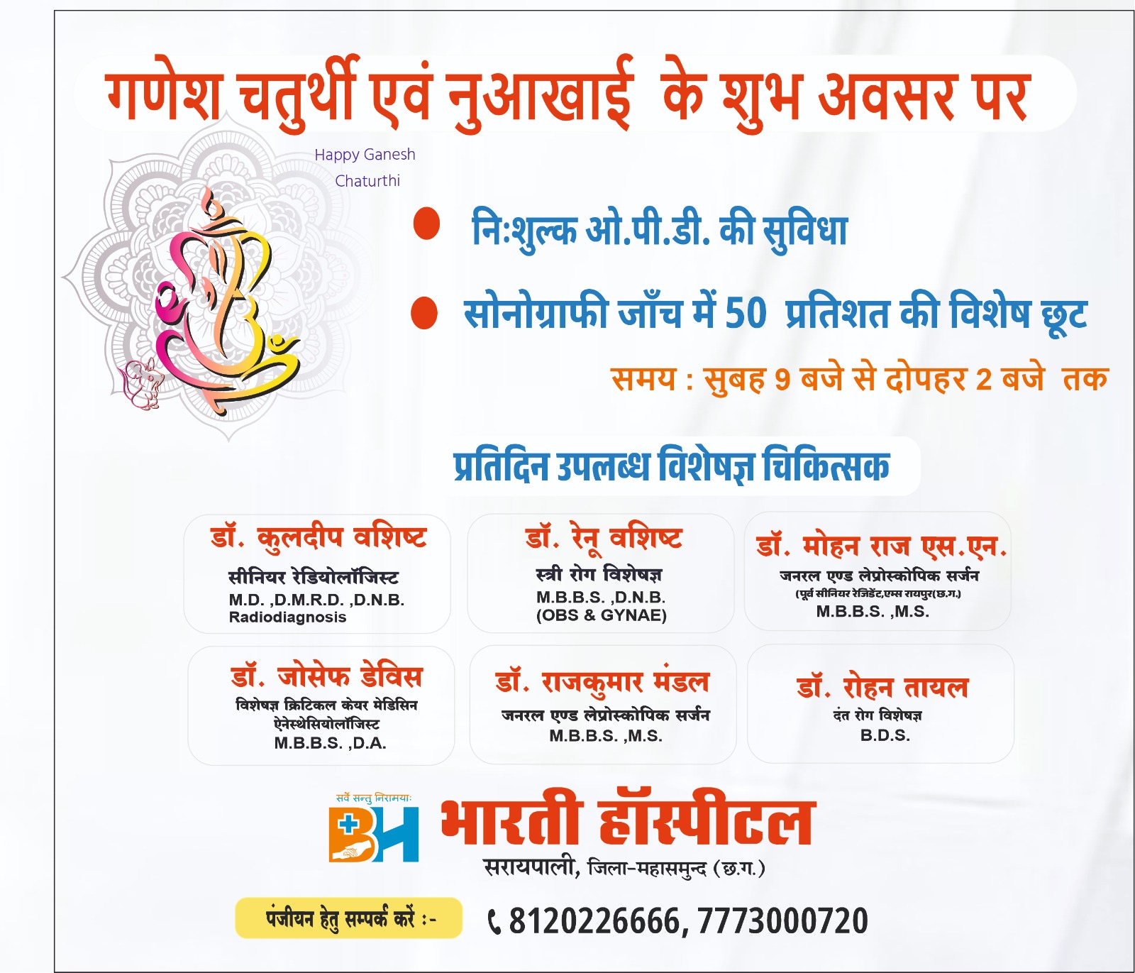 सरायपाली.भारती हॉस्पिटल सरायपाली में गणेश चतुर्थी एवं नुआखाई के शुभ अवसर पर निःशुल्क ओ.पी.डी. की सुविधा और सोनोग्राफी जाँच में 50 प्रतिशत की विशेष छूट दी गई है।समय : सुबह 9 बजे से दोपहर 2 बजे तक इसके अलावा प्रतिदिन उपलब्ध विशेषज्ञ चिकित्सक जैसे:डॉ.कुलदीप वशिष्ट( सीनियर रेडियोलॉजिस्ट M.D.,D.M.R.D.,D.N.B.Radiodiagnosis)डॉ. रेनू वशिष्ट स्त्री रोग विशेषज्ञ M.B.B.S., D.N.B. (OBS & GYNΑΕ)डॉ.मोहन राज एस.एन.(जनरल एण्ड लेप्रोस्कोपिक सर्जन (पूर्व सीनियर रेजिडेंट, एमा रायपुर (छ.ग.) M.B.B.S., M.S.)डॉ.जोसेफ (डेविस विशेषज्ञ क्रिटिकल केयर मेडिसिन ऐनेस्थेसियोलॉजिस्ट M.B.B.S., D.A.)डॉ.राजकुमार मंडल(जनरल एण्ड लेप्रोस्कोपिक सर्जन M.B.B.S., M.S.)डॉ.रोहन तायल(दंत रोग विशेषज्ञ B.D.S.)भारती हॉस्पीटल सरायपाली, जिला-महासमुन्द (छ.ग.)पंजीयन हेतु सम्पर्क करें :-8120226666, 7773000720