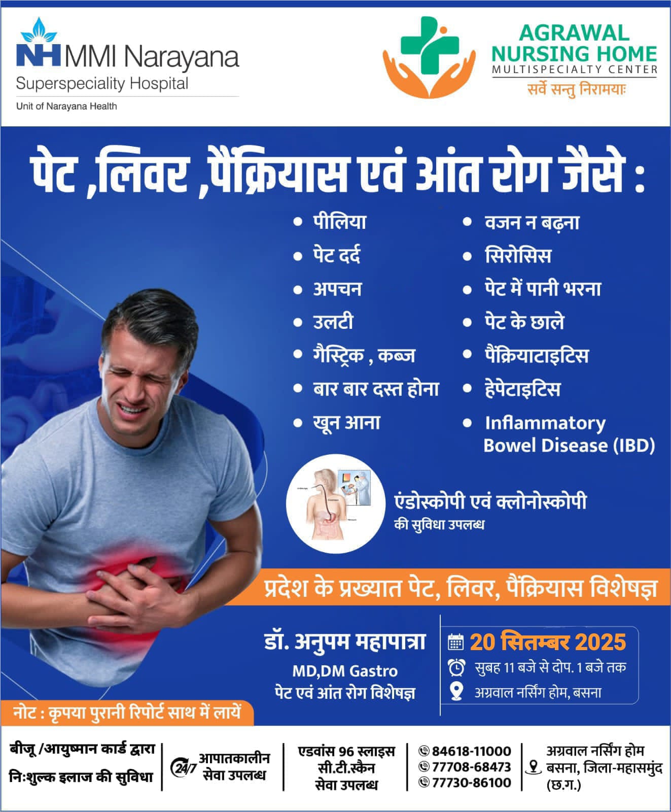 पेट एवं आँत रोग विशेषज्ञ डॉ अनुपम महापात्रा 20 सितम्बर को अग्रवाल नर्सिंग होम बसना में उपलब्ध रहेंगे