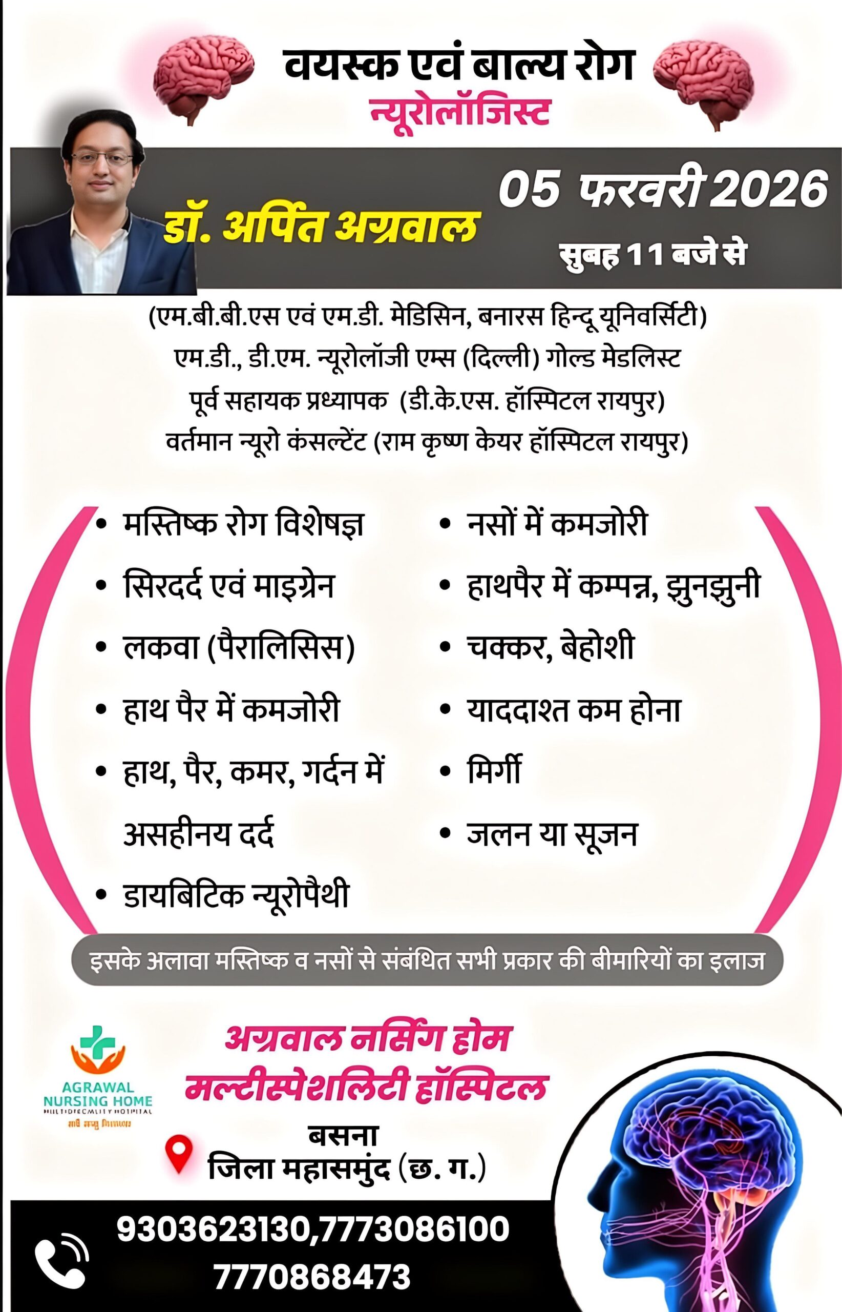 वयस्क एवं बाल्य रोग न्यूरोलॉजिस्ट डॉ.अर्पित अग्रवाल 05 फ़रवरी को उपलब्ध रहेंगे अग्रवाल नर्सिंग होम बसना में
