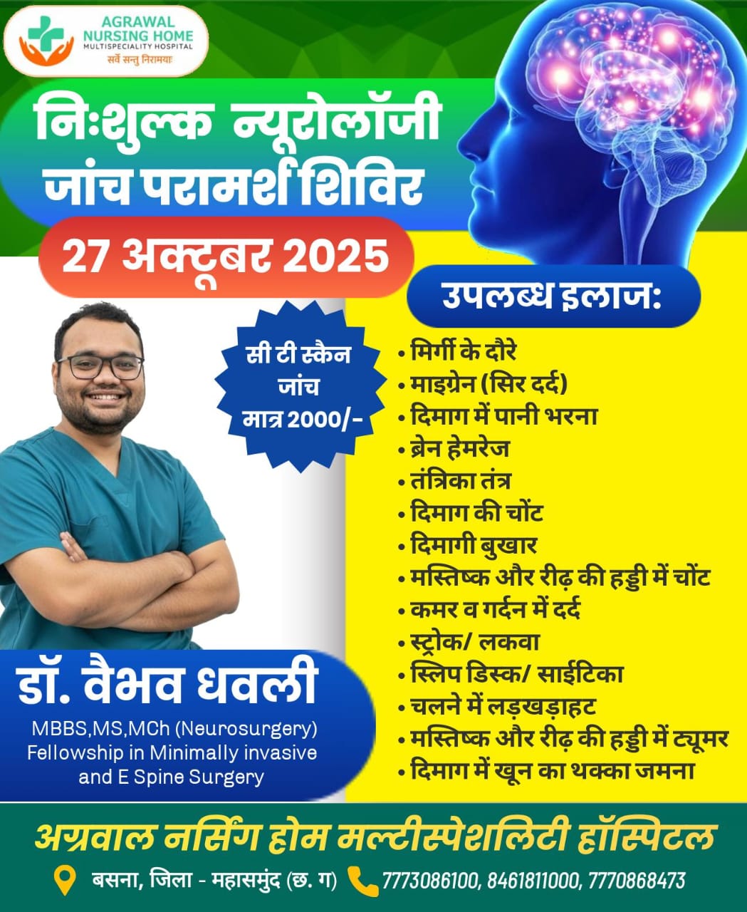 वयस्क एवं बाल्य रोग न्यूरोलॉजिस्ट डॉ.अर्पित अग्रवाल 04 अक्टूबर को उपलब्ध रहेंगे अग्रवाल नर्सिंग होम बसना में