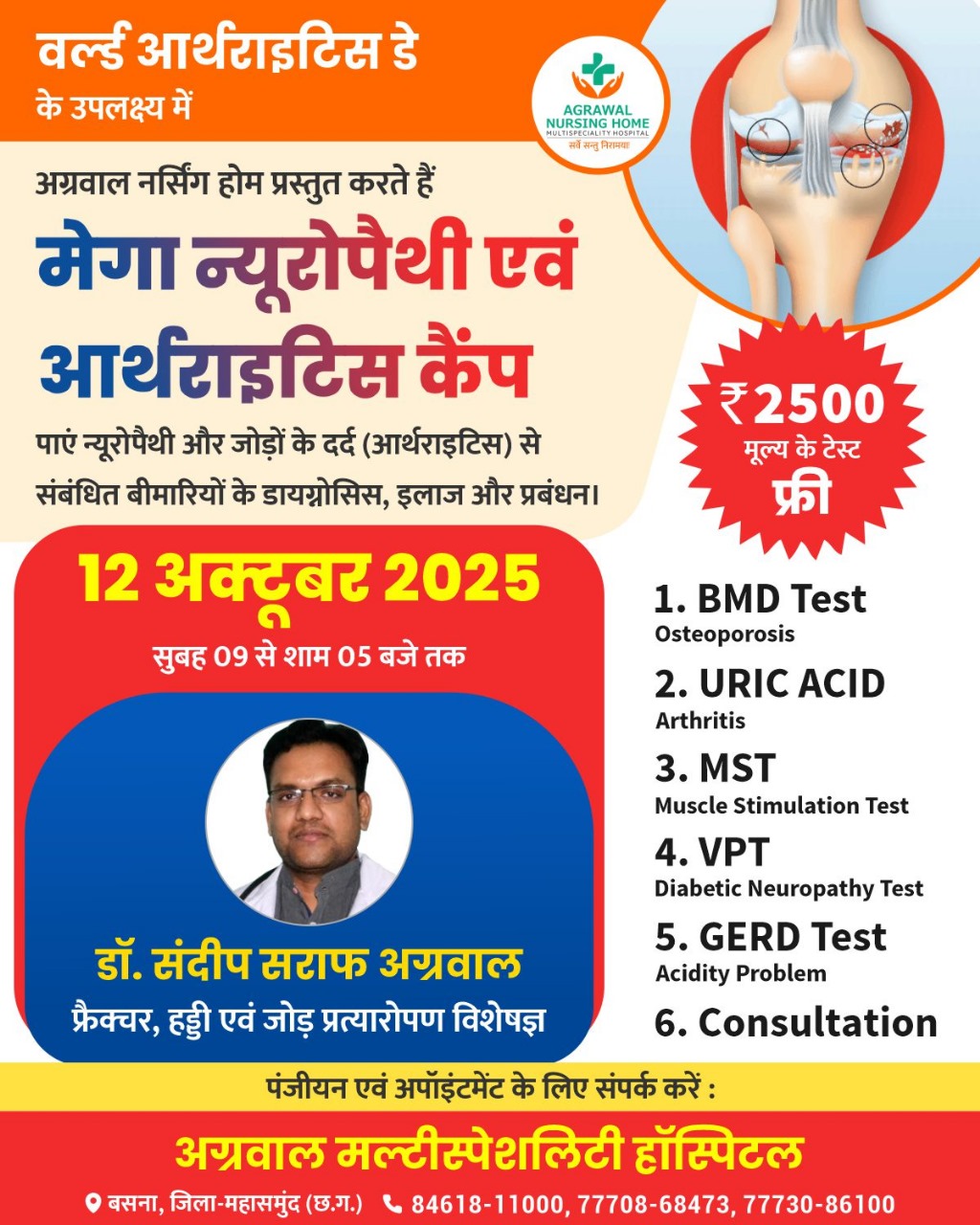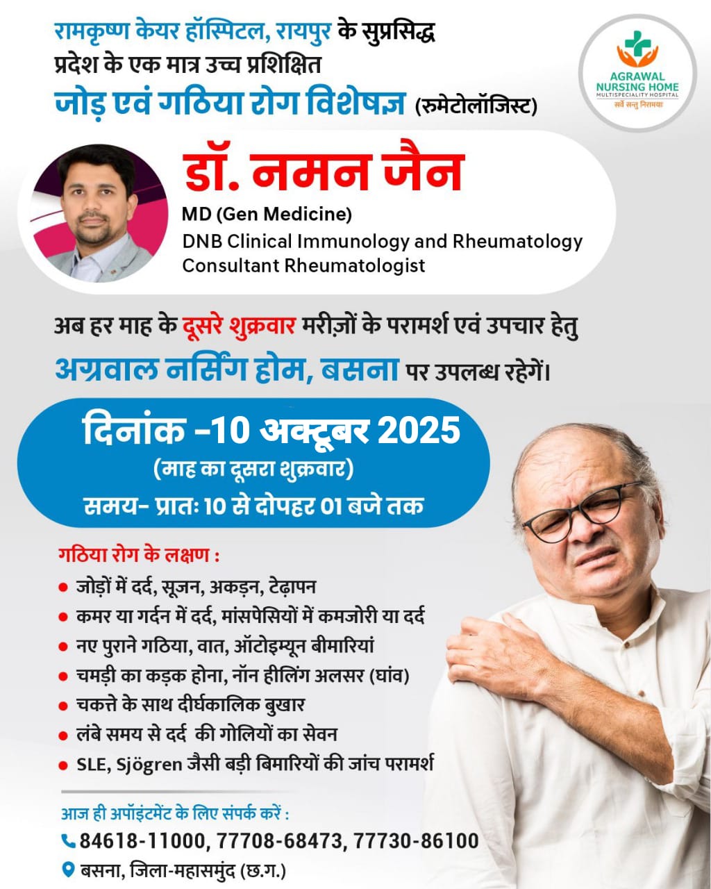 रायपुर के सुप्रसिद्ध प्रदेश के एक मात्र उच्च प्रशिक्षित जोड़ एवं गठिया रोग विशेषज्ञ (रुमेटोलॉजिस्ट) 10 अक्टूबर को उपलब्ध रहेंगे अग्रवाल नर्सिंग होम बसना मे